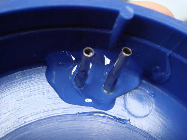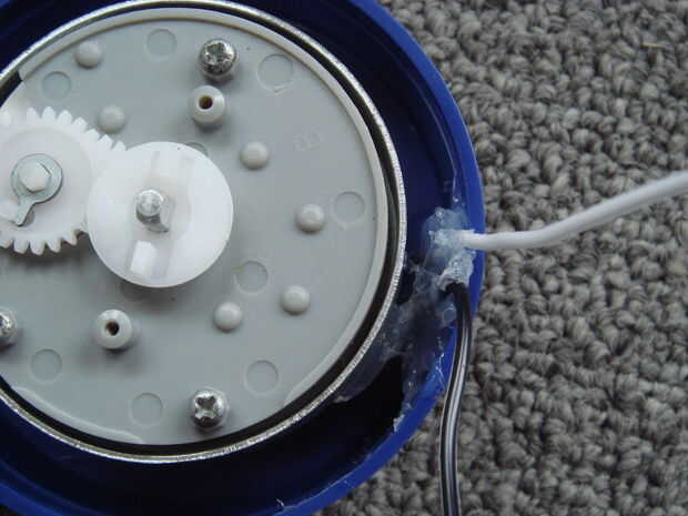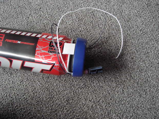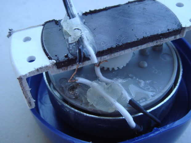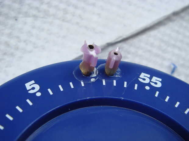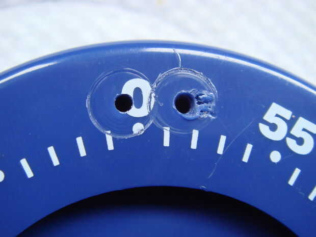 El objetivo de este paso es crear dos pares de puntos de contacto en el temporizador del huevo. Un par será en la parte giratoria del temporizador huevo a las puntas de la jeringa, y el otro par sea en la parte fija a alguna lana de acero. Una vez que el temporizador está programado el condensador va a ser conectado en las puntas de la jeringa, y cuando el tiempo llegue a cero los dos pares de puntos de contacto se tocarán unos a otros completando el circuito. Esto descargará la carga completa del condensador a través de la lana de acero, encendiendo y cualquier mezcla pirotécnica en el poder.