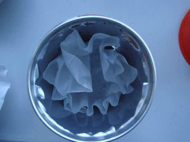 Ponga un trozo de papel o filtro de café dentro de la lata para evitar que el polvo se derrame hacia fuera los agujeros en el lado.