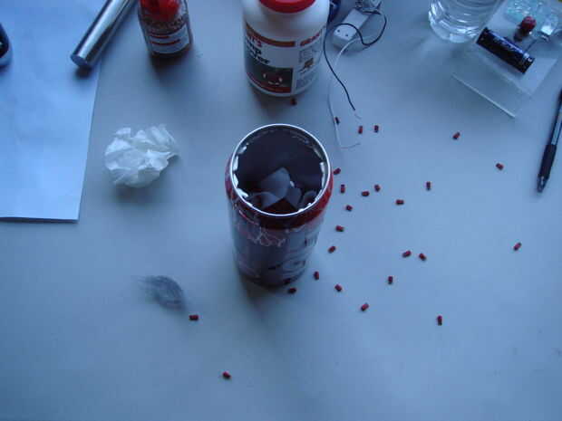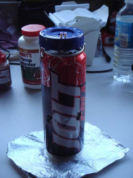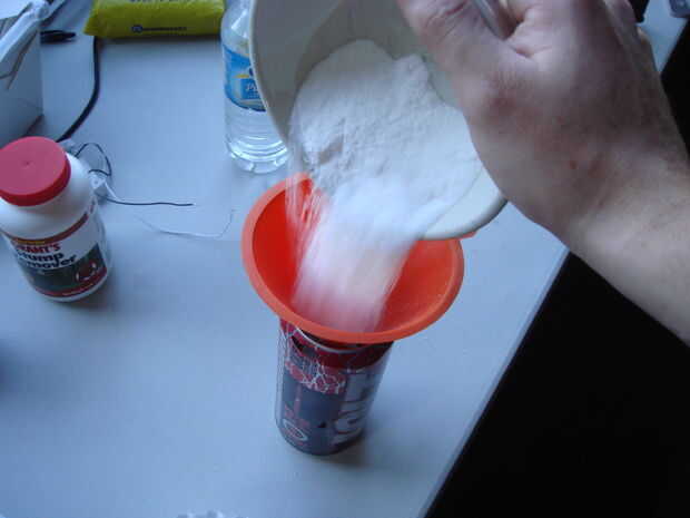 Vierta un poco más entonces la mitad la mezcla en la lata. Fije la parte fija del temporizador huevo a la lata y coloque la lana de acero y cables en la mezcla. Vierta el resto de la mezcla pirotécnica sobre la lana de acero. Fije la parte giratoria del temporizador huevo encima de la parte fija, y ya está.