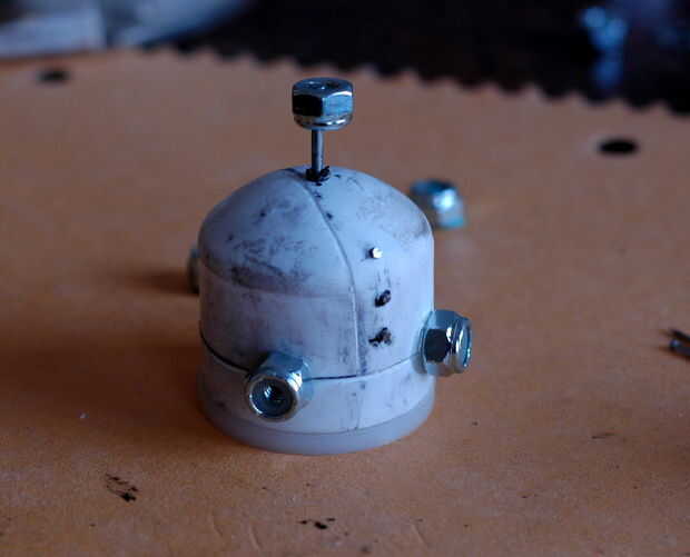 Utilizar 1/2" clavos para hacer los tres remaches que corren hacia abajo de su frente. Los clavitos con alicates de punta, calentar los puntos en una llama de vela y presione en la tapa que desee. Hacer su antena de la misma manera, usando un alambre del clavo para que usted se ajustaron una tuerca de tope. Luego pegue los ojos y la lavadora (que es su quijada más baja) en el lugar.
