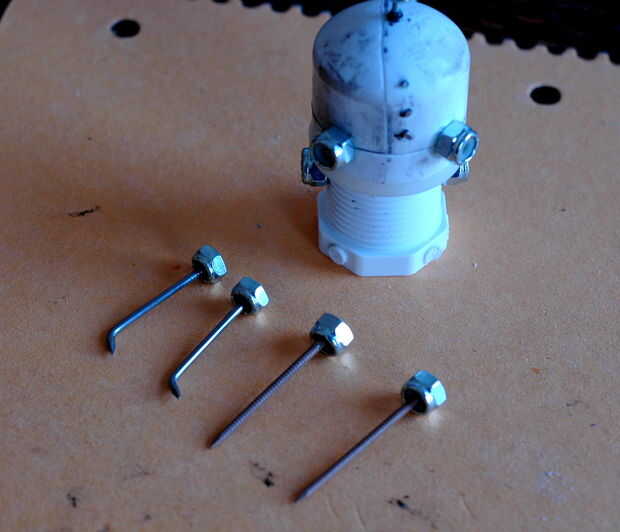 Brazos y las piernas de José son los clavos. Usé clavos del panel para las piernas porque tienen una textura un poco a ellos, pero usted no puede doblar clavos del panel, por lo que no utiliza para sus brazos. Sus brazos están doblados en los extremos para que encajen en sus hombros. Al final de cada clavo, pegamento una tuerca de tope. Usé las tuercas un poco más pequeñas para las manos.