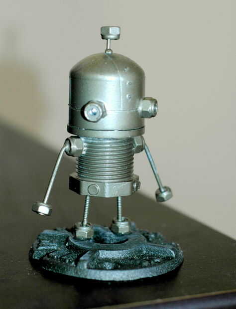 Lo pinte con una capa de cromo y luego una capa delgada de bronce antiguo. Si usted está preguntando lo que él está de pie sobre, se llama una lavadora' maleable' y se utiliza en la construcción del muelle. Me recordó a las tapas en el juego!