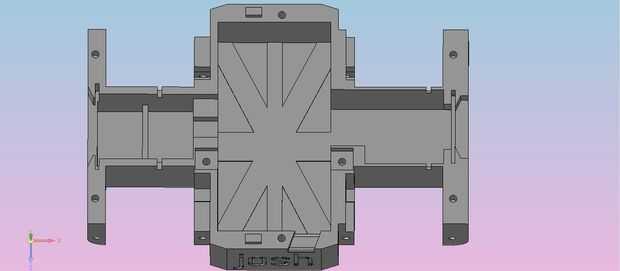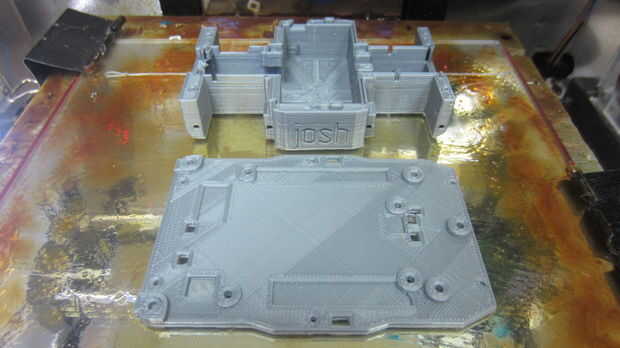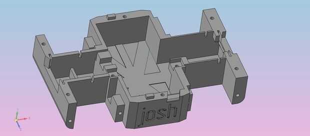 Todo lo que necesitas para JoshBot imprimir en una impresora 3d. Esta es la base. Conectado a Arduino Uno. El puente de la batería que los cables no interfieran con nosotros durante el montaje. También imprimir el soporte para Bluetooth Arduino Uno dentro y un soporte para el sensor de ultrasonidos. La rueda consiste en piezas impresas y bandas de goma (neumático). Utilicé una goma del motor del coche ruso de 37 mm de diámetro. En su país es necesario encontrar un reemplazo.