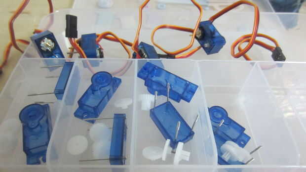 Dentro del motor servo soldado el led con una resistencia en paralelo con los contactos del motor rojo. Esto no es absolutamente necesario, pero lo hice. Dos servo motores deben ser soldadas a la polaridad del led, porque tenemos dos servo motores que gira en una dirección y dos en otro. En la oscuridad se ve muy bien. Lo sentimos, me olvide de tomar estas fotos, en el siguiente paso (en la foto) se pueden ver las resistencias y diodos en los servos.