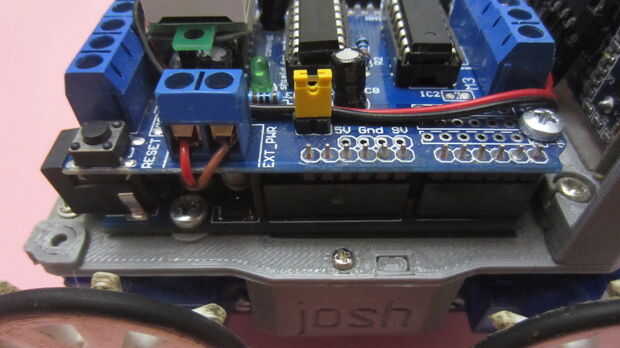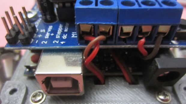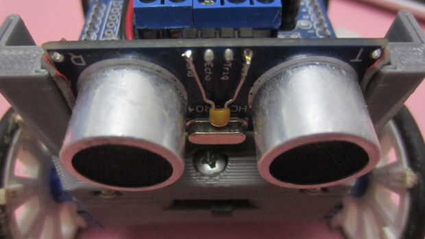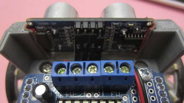 Conectar los cables al conjunto de Adafruit L293d. el titular bajo el sensor de ultrasonidos. A las ranuras del soporte he pegado cinta de doble cara y entonces inserta el sensor. Esta decisión se toma porque plástico realiza el ultrasonido y si se inserta sin un aislante, se distorsione las lecturas. También había soldado el condensador 104 para el vcc de contactos y gnd del sensor para eliminar el ruido en la potencia y voltaje sumerge. Sin él, el sensor funciona mucho peor.