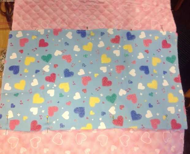 前のステップでつけた折り目を利用して、本体の上に飾り布を重ね、折り目を合わせる。
