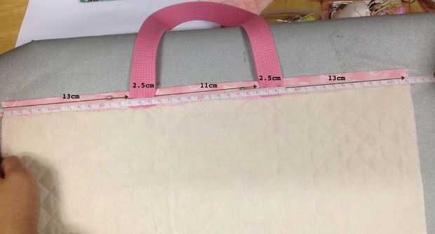持ち手をマチ針でとめる。 (持ち手テープの向きが同じになるように気をつけてください)