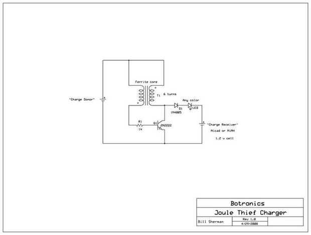 Mi ladrón de joule utiliza cable de red trenzado pasado a través de un pequeño núcleo de ferrita. Yo uso 6 vueltas de alambre. Usted puede encontrar una base de un bulbo fluorescente compacto quemado. Puedes ver cómo otros la bobina de la herida y construido al Joule Thief, ya que muchos lo han hecho. Sólo añadir un diodo y un LED en serie con la carga de la batería. El LED es útil como un indicador de carga.