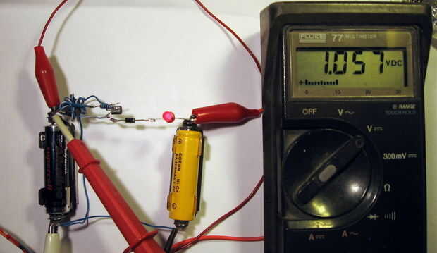 La célula donante en la izquierda tiene un voltaje de voltios 1,057. Esta batería está cargando la batería de la derecha.