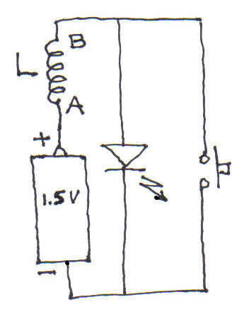 Pero cuando el interruptor se libera y apagado, el campo magnético se derrumba repentinamente y crea una tensión de 1,4 voltios con una polaridad inversa. Esto significa que el punto B ahora es 1.4 voltios de mayor (más positivo) que el punto A. Está como si la bobina tiene a ser como una batería temporal conectado en serie con la batería real, presentando 2,8 voltios el LED. El LED reacciona a esto intermitente en un momento muy corto. Si se empuja el interruptor otra vez repite este ciclo. Si podía empujar el interruptor lo suficientemente rápido, el LED parece sólidamente ON.