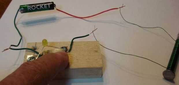 Ahora el interruptor se mantiene presionado y hay flujo de corriente a través de la bobina. El interruptor sólo tiene que encender momentáneamente para crear un campo magnético. Además, el interruptor es cortocircuitar el LED.