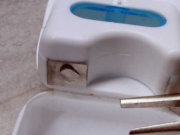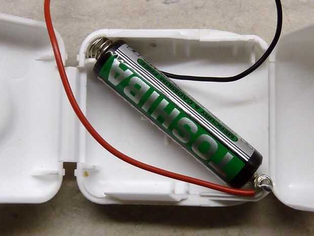 Guardé mi caso vacía hilo dental con este proyecto en mente. Resulta que una pila tipo AAA sólo cabe dentro. También está hecho de material durable, flexible. Lo primero que hice fue sacar el carrete y el cortador de hilo. Estaba pensando en utilizar para conectar un lado de la batería, ya que cabe perfectamente en una ranura de la esquina en el interior. Por desgracia, yo no podía realmente hacer que funcione. Resulta que cada milímetro cuenta aquí. Decidí usar un resorte que rescató de un sostenedor de batería roto y un tornillo. Hubiera sido mejor si hubiera sido un tipo rasante en lugar levantado uno que terminé con, pero eso es todo lo que pude encontrar. Después de soldar un cable de núcleo sólido a la primavera, sostuve la batería hasta ver donde iría el lado positivo y taladré un agujero allí. No hubo absolutamente ningún espacio sobrado. El primer tornillo que utilicé estaba hecho de un metal que sólo no pega para soldadura, no importa cuánto presentó y arena. Me quedé un poco de estaño al extremo del que terminé usando mientras no se atornilla en el plástico. No quería derretir cualquier cosa. Había soldado el cable trenzado rojo en lo antes posible después se atornilla en. La razón que utiliza base sólida para la negativa fue a darle un poco de la rigidez para que no saltara el resorte. No estoy usando ningún pegamento caliente para este proyecto. Con la batería montada, era hora del ladrón de joule.