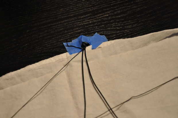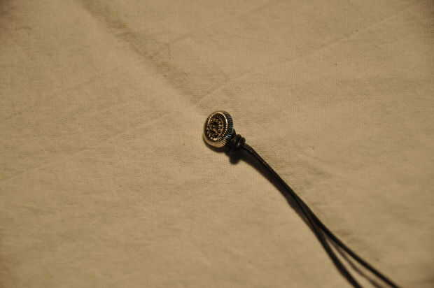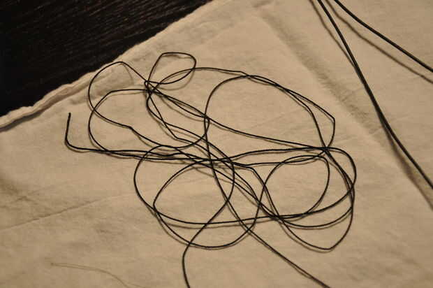 Atar el extremo de su hilo de seda sobre el cordón de cuero de izquierda. Até unos tres nudos. No quieres salir. He dejado un poco de cola. Si usted quiere atar un cordón en más tarde, para la decoración, dejar unas pulgadas por lo que se puede atar fácilmente.