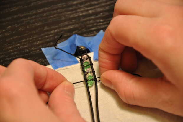 Traiga el hilo hacia la izquierda (pasó el cuero adecuado por lo que ahora se envuelve el hilo alrededor de él) volver a través de la cuenta y pasar por debajo a la izquierda. (Cualquier lado del cuero están dejando de, usted debe estar en la parte superior, y cualquier lado te vas, vas debajo y alrededor de) (Imagen 6)