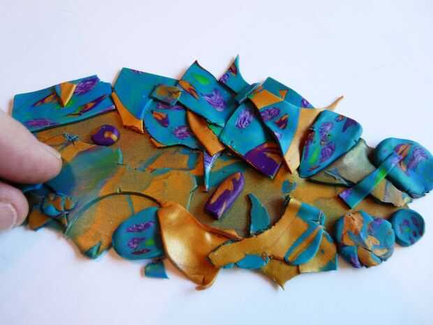 Comienzan entonces establecen piezas sobre una superficie plana. Utilicé restos y trozos de caña de otro proyecto. Puede usar lo que quieras, en que colores y colocar la arcilla en cualquier patrón que desee.