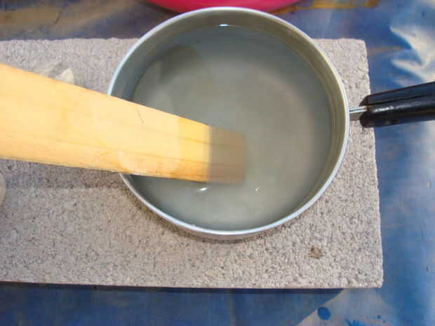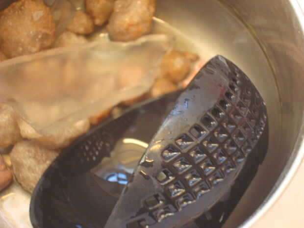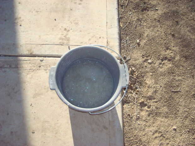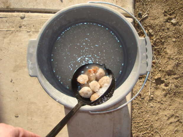 Luego tomar la cacerola fuera y volcar el agua caliente en un recipiente de plástico.