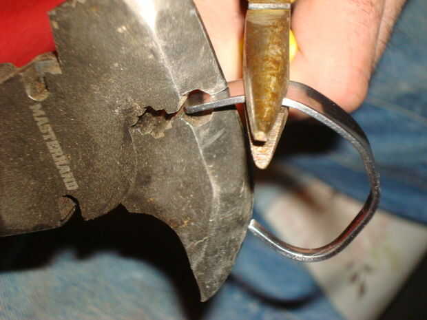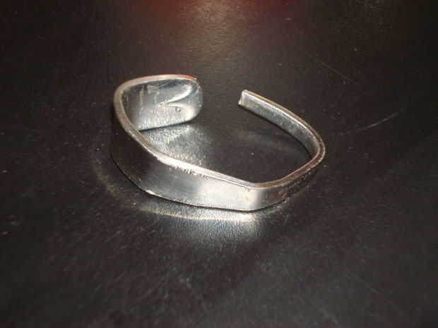 Utilizando los alicates y mordazas de tornillo corte el mango de la cuchara. Doblar la sección del mango en forma de anillo, usando alicates y un par de mordazas de tornillo de banco.