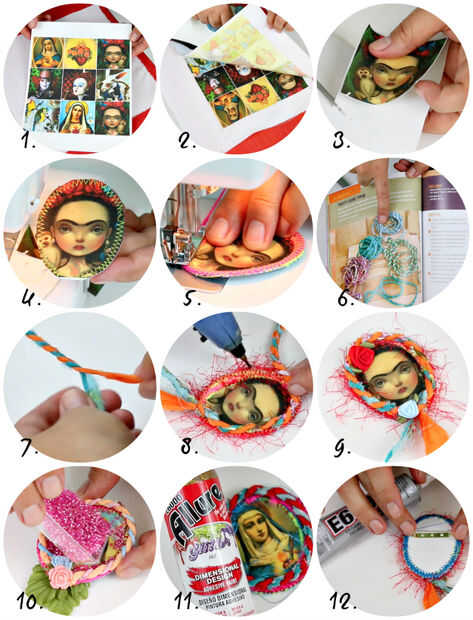 8. y 9. Caliente pegar el hilo de la tela alrededor de la imagen y adornar con tela y flores de plástico