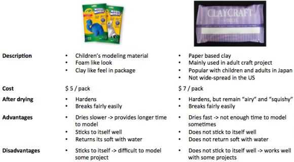 Conductor arcilla: arcilla conductora fue utilizado en el proyecto de broche. Fue creado mediante la mezcla de polvo de carbón con arcilla. La arcilla era bastante conductora cuando se seca, se calienta y enfría rápidamente la tinta del pigmento de cristal. Esta es un área que quieren explorar más y crear más proyectos. Algunas desventajas son que la arcilla es color negra, por lo tanto puede no ser atractiva cuando no se utiliza con tinta de cristal. La arcilla es también frágil y agrieta fácilmente. Más experimentación con porcentaje de polvo de carbón y arcilla debe ser documentados para obtener la mejor combinación.