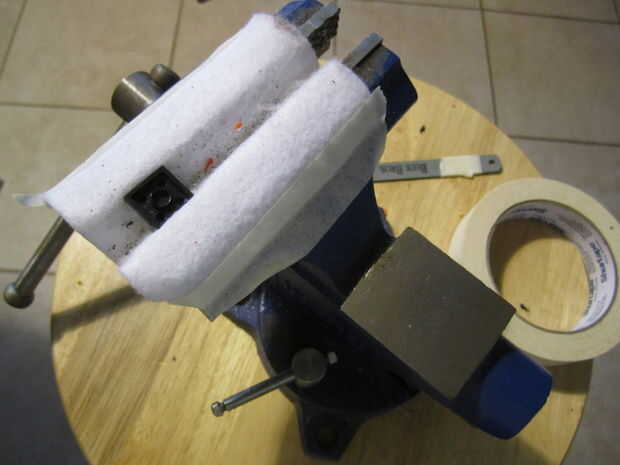 * Coloque una de las placas de 2 x 2 en un tornillo de banco y corta una "zanja" en la parte de atrás que es lo suficientemente grande para encajar el alambre.