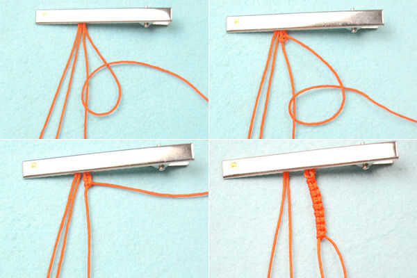 1 º preparar uno 80 cm y 140cm uno hilos nylon naranja, unir dos hilos, doblar los dos hilos en el medio el hilo de 80 cm. fijar los hilos con un clip, tiene 4 hilos, son 40cm, 40cm, 40cm y 100 cm. utilizan el tercer hilo de 40cm como eje, tie alondras 8 nudos cabeza con la derecha más hilo de rosca;