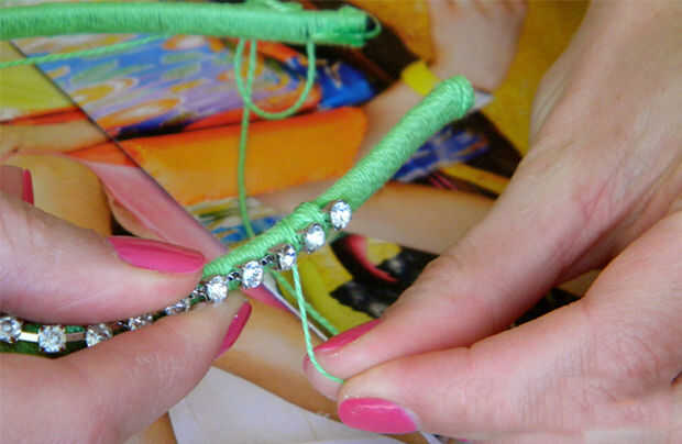 Paso 5: Elegir el lugar de su ajuste del rhinestone comenzará y empezar a envolver una tira nueva de hilo alrededor de la cadena al igual que antes. Asegúrese de que pegue el principio del hilo de rosca en lugar demasiado.