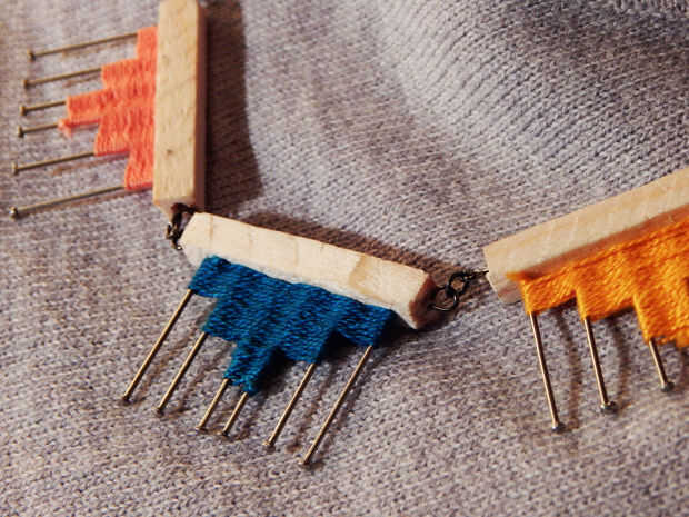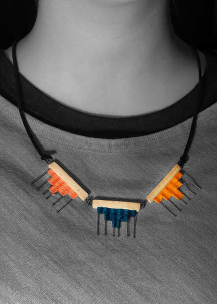 Quería hacer la joyería de la chincheta y madera. En el proceso de creación de esta joyería. Fue de gran ayuda el uso de los hilos de colores y el patrón de Azteca.