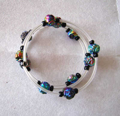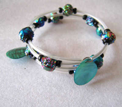 Pulsera acabada; en la segunda foto he añadido cáscara cuelga a los lazos que hice en los extremos del alambre. Alambre de memoria es difícil doblar pero lo puedes hacer.