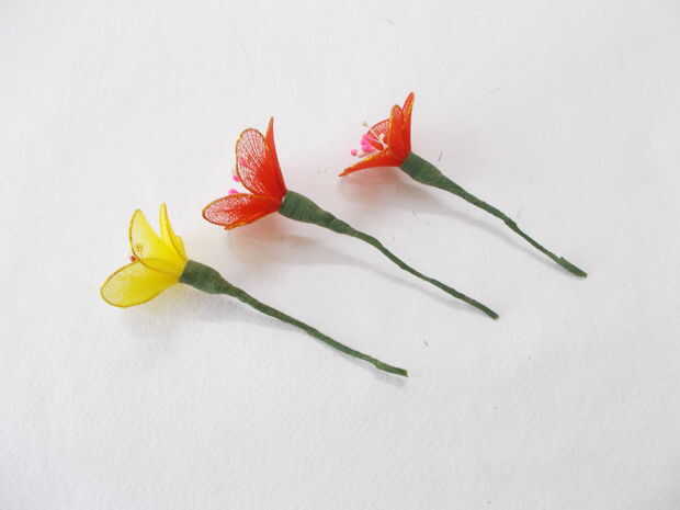 Hacer flores de medias múltiples y cubrir el tallo con la cinta verde.