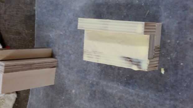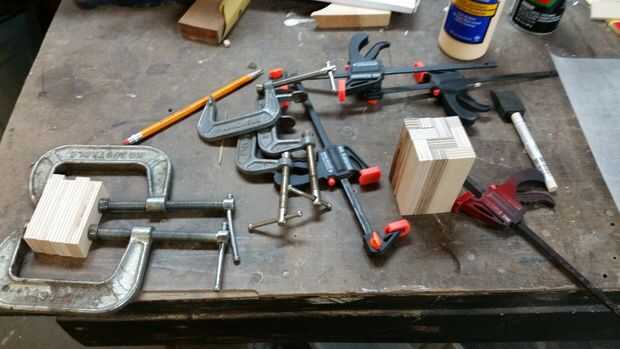 3) organizar las piezas del patrón y sujetarlos en el lugar antes de aplicar cualquier pegamento. Esto facilitará la abrazadera después de aplica el pegamento. Utilizar un montón de pinzas! Encontré que necesitaba algunos 1/4" madera contrachapada ligeramente más pequeño que los laterales para unir todas las piezas.