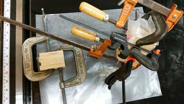 5) deje que el pegamento seque durante la noche. Cuando retire las abrazaderas de limpiar el pegamento por todos lados. Utilicé una lijadora de banda estacionaria.