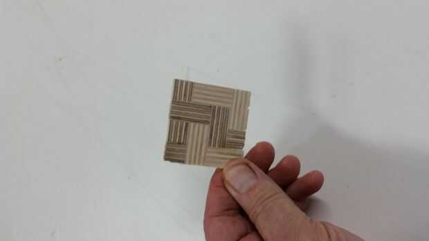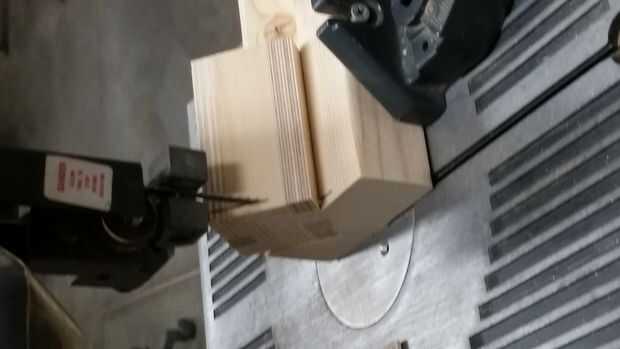 1) cortado a 1/8" rodajas gruesas. Este es un proceso peligroso puesto que las piezas pequeñas hacen fáciles de conseguir los dedos cerca de la cuchilla de corte y la densidad de cambios de madera dentro de cada hoja, así que mucho cuidado es una necesidad! Si los capturas o grietas se destruirán la rebanada. Usé una sierra de banda con un elemento (2 x 4 con un corte "V" en él) para que sea más seguro para cortar y mantener los dedos lejos de la lámina.