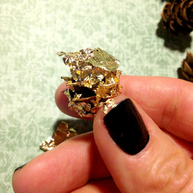 Ahora, envolver el cono de pino en la hoja de oro