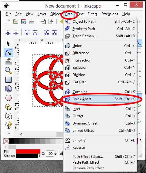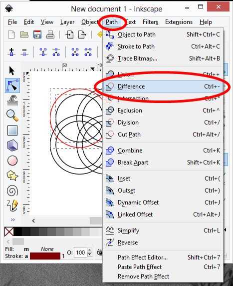 7. En el menú trazado haga clic en 'differnce'. Esto corta el círculo más pequeño en el centro del círculo más grande, creando un anillo. Yo he subrayado el anillo en rojo.