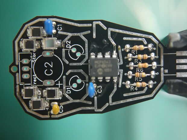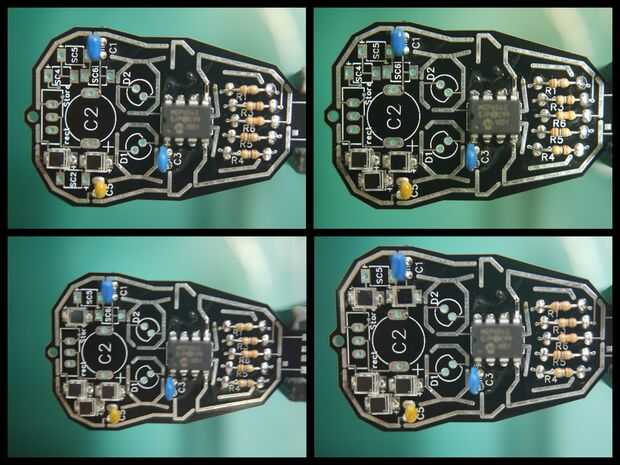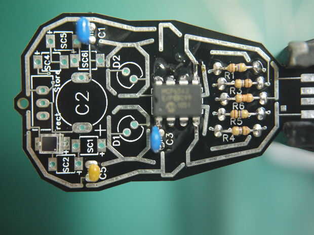 Siguiente foto-diodos, también conocido como las células solares mini. Es realmente importante que éstos se ponen correctamente. El extremo positivo está marcado en el tablero con un +. El resultado positivo en el fotodiodo tiene un pequeño punto, así como un extremo de metal que se convierte en el pin. Coinciden con el + en SC1 a través de la unidad SC6. Como con el chip, tendrá que apretar suavemente los cables juntos para hacerla deslizar en los agujeros. Soldarlos en desde arriba uno a la vez.