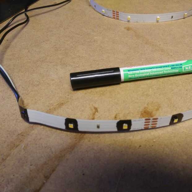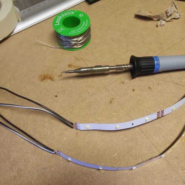 El LED tiras soldar un cable eléctrico con el positivo y el negativo. Todo el color del indicador LED negro para que la tira led es invisible sobre un fondo negro.