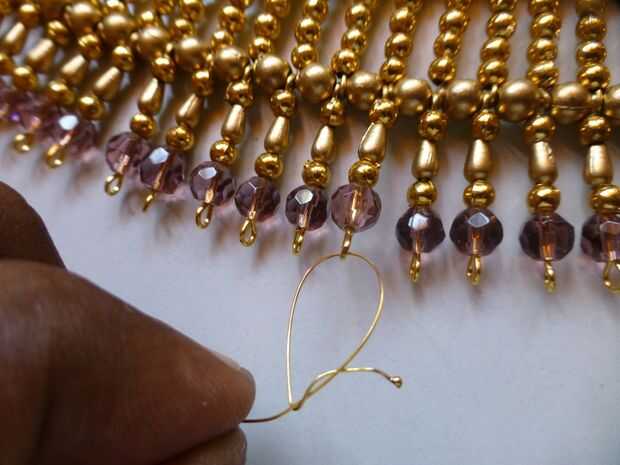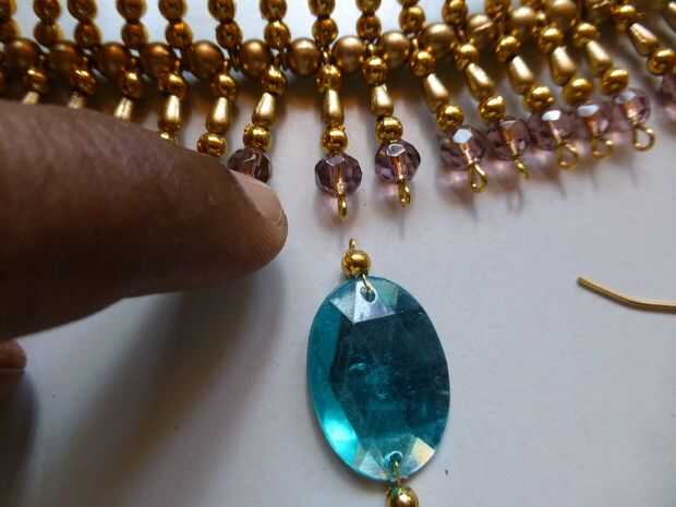 - Coloque una pieza en el ojal inferior del enlace con cuentas cristal pasando el cable por el ojo a la pieza derecha del centro.