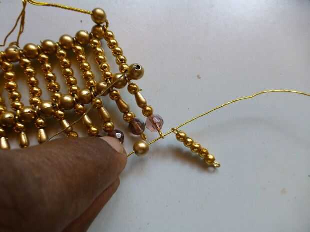 - Alternar entre cuentas de 5 mm y 3 mm cuentas enlaces, pasando por los ojos de abajo de los enlaces con cuentas de cristal. Puede llevar en la adición de granos y enlaces sólo un enlace antes de la central marcado.