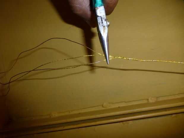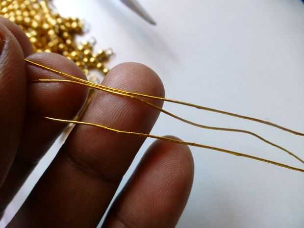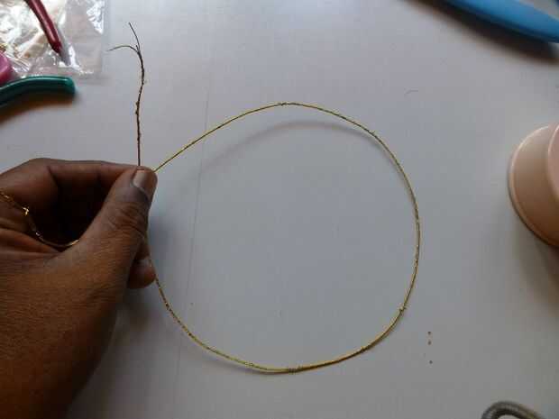 Los cables alrededor de la porción del cuello deben ser suficientemente rígidos para mantener la forma. Por lo tanto, he utilizado 3 hilos de alambres de 60 centímetro largo oro plateado y torcidos juntos para hacer una sola pieza.