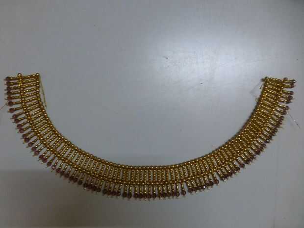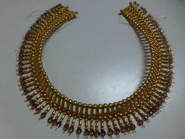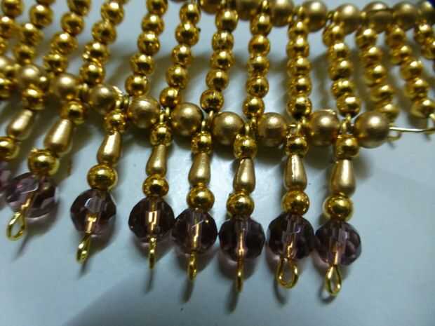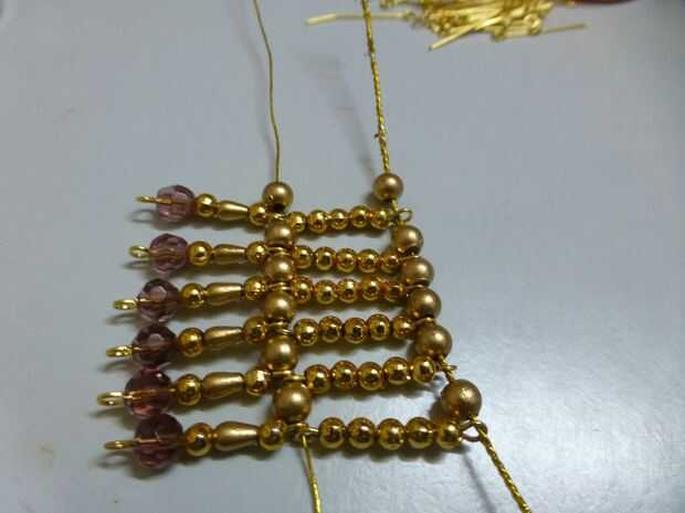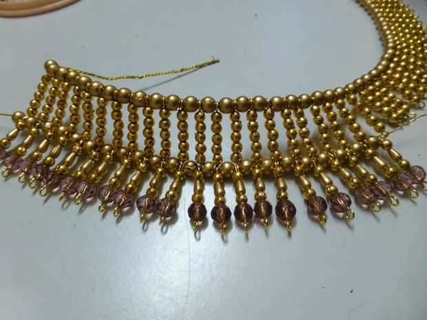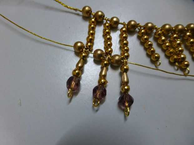 Tomar una hebra de hilo y a partir de un extremo alternando entre perlas de 5 mm oro y enlaces con cuentas de cristal hasta el otro extremo. El cable pasará también a través de los ojos de la parte inferior de la parte superior acabada antes del collar.