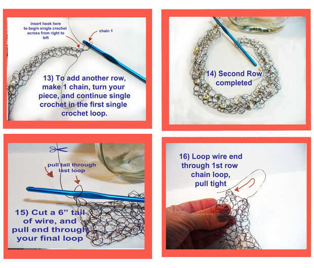 15) al final de la última fila, después de haber hecho un punto bajo en el último bucle de punto bajo, cortar una cola de alambre de 6" de largo, hilo sobre y tire el extremo del cable a través del bucle en el gancho.