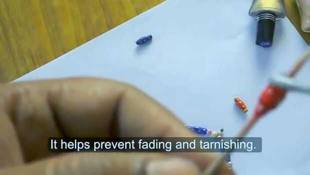 Ahora, puede aplicar la acuarela de su elección, dejar que se seque. Hacer un diseño si lo desea. Aplique la pintura de uñas (transparente) en grano seco color. Esto le dará su color duradero de joyería de papel, color brillante brillante y lo hará impermeable.