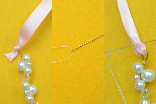 1 º, preparar dos cinta 15cm rosa, conecte la cinta a ambos extremos atando un nudo, coser la cinta para que la cinta de fijar la cadena de granos firmemente;