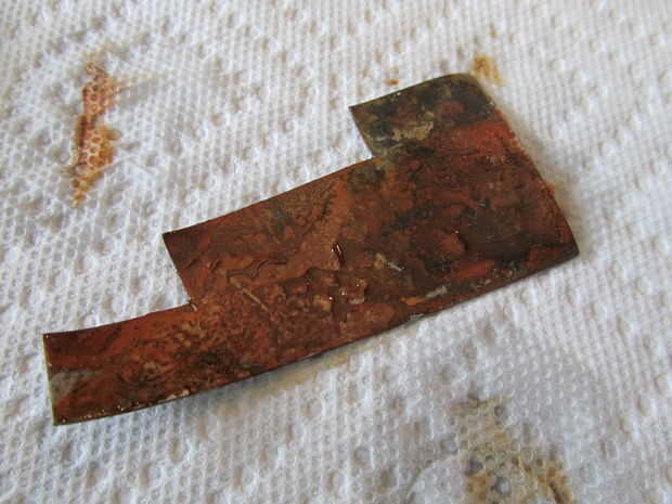 La chapa de 22 calibre oxidado mucho. Pensé en pulir un trozo a un final del espejo y caer en el agua otra vez pero no me imaginé esto. Final de cualquier pieza de joyería hecha con metal de hoja, aunque la mayor parte de puede ser pulida a espejo, habrá algunas áreas pequeñas que no. Incluso los mejores esfuerzos de pulido no hacen a prueba de agua.