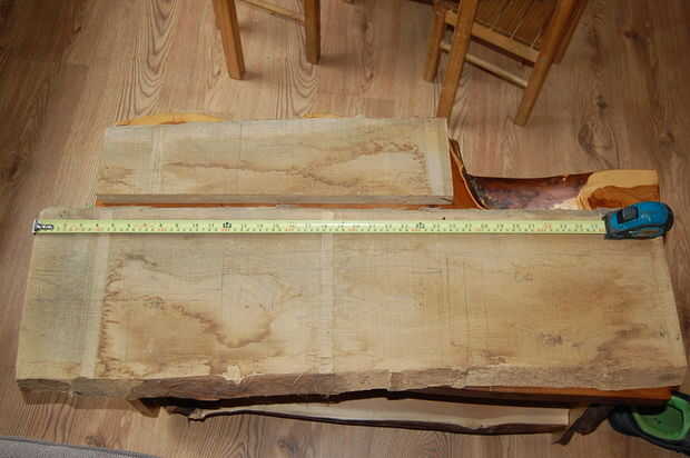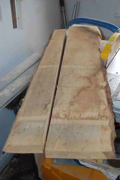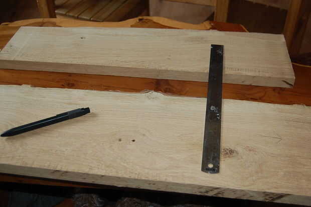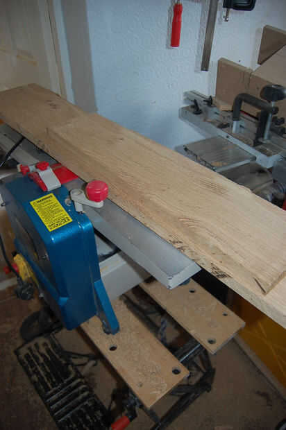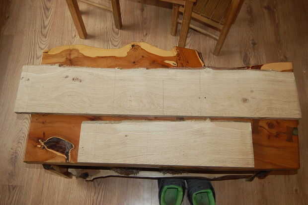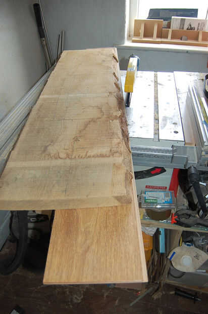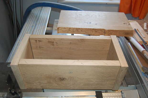 Tenía dos pedazos de roble pippy, 1000 x 400 mm y el otro alrededor de 500 mm x 140 mm así por dibujar en la madera que sabía que tenía que hacer un panel lateral de la pieza más pequeña por lo que la altura máxima de la caja iba a ser de alrededor de 140 y en proporciones agradables para los paneles laterales, decidí que el ancho de la caja sería 175mm. Por lo tanto arrancó el pedazo grande de roble a alrededor de 200mm de ancho me da un poco de espacio de recorte. Como ambos los bordes del roble fueron tanto waney necesitaba crear un borde recto, por lo que yo pude extraer con seguridad - lo hice simplemente clavando un sobrante de laminado del suelo en la parte inferior de la madera y quitar una vez que había cortado la madera.