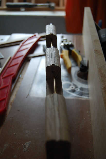 Esto es eran esto construir comienza a conseguir un poco más complicado y preciso. En este cuadro la bisagra va a ser largo y integral de la parte posterior y los paneles superiores, es esencialmente el dedo articula con los bordes redondeados con un agujero en el centro donde se inserta una varilla de pasador. El problema con este tipo de bisagra es cómo crear un agujero muerto central a través del centro de las articulaciones de bisagra, he visto plantillas profesionales (con las etiquetas de precio profesionales para emparejar) que ayuda con las juntas de corte y perforación de los agujeros, pero esto es fuera de mi liga. No tengo una broca larga y aunque lo hice no creo que yo sería capaz de perforar en el lugar correcto a través de la bisagra. Un par de años vi un par de técnicas que podrían utilizarse para lograrlo fácilmente. Todo lo que hacemos es cortar una ranura con la hoja de Sierra de mesa a la profundidad del extremo del pasador de la bisagra, inserte el pin/varilla en la ranura y pegamento en algunas piezas de relleno para cubrir la varilla.