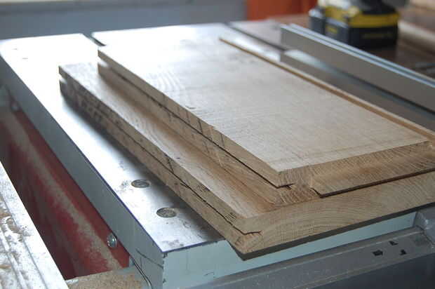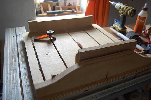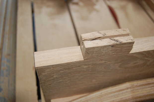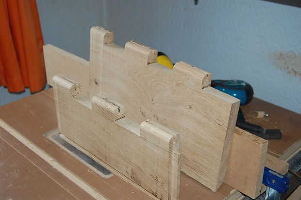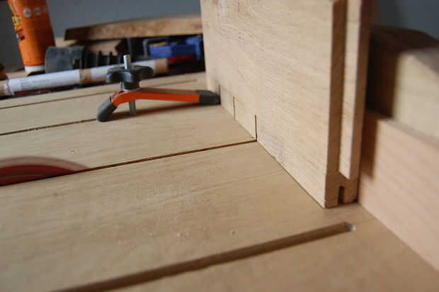 Entonces coloco un lado de ambos paneles a través de la mesa de fresadora con un todoterreno sobre algo como esto sólo permitiría la bisagra al abrir 90 grados. Como quería que abrir un poco más de 90 grados corte un pequeño todoterreno sobre la parte a los otros lados. Luego probé la articulación antes que fija la barra central en el panel trasero con algunos rellenos de roble que había cortado. La parte de relleno central tuvo que cortar a la anchura correcta pero las piezas de relleno exterior se pueden cortar tamaño y cortado más adelante.