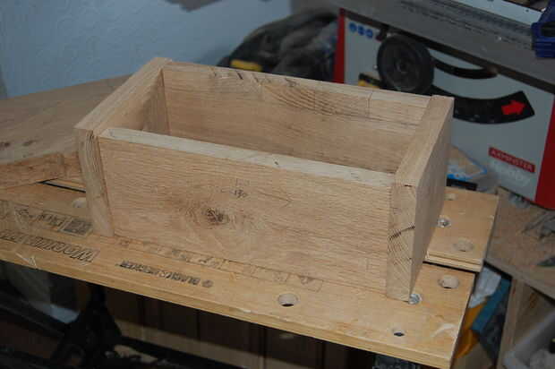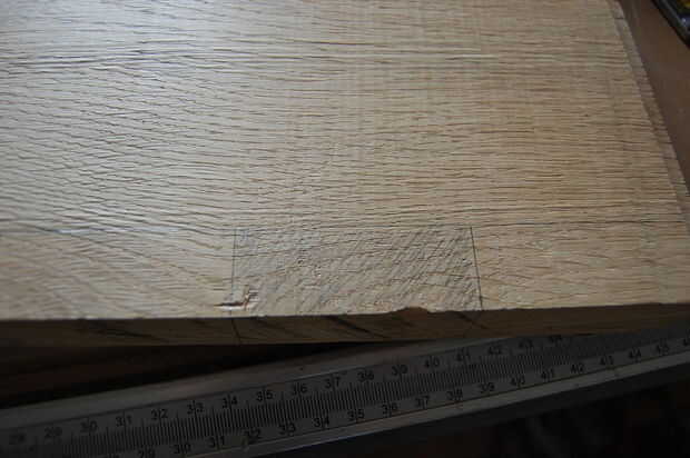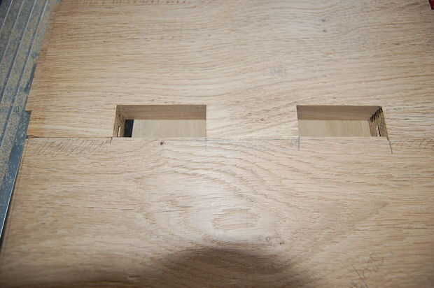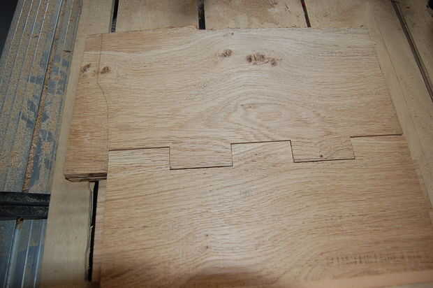 Luego marqué hasta la parte trasera. Estos corte iban a ser 22 x 60 mm decidí cortar las bisagras de mi mesa vieron usando una cruz corte trineo. Esto permitiría para ver exactamente donde la hoja se iba a cortar y me daría suficiente precisión para esta articulación. Comencé cortando las ranuras a cada lado de las ranuras de la bisagra seguida por los residuos en el medio. Luego usé las articulaciones de la parte trasera acabada marcar las juntas de la tapa y cortar estos del mismo modo. Una vez que realizaron tanto que tenía que hacer un poco de ajuste para conseguir que calcen bien.