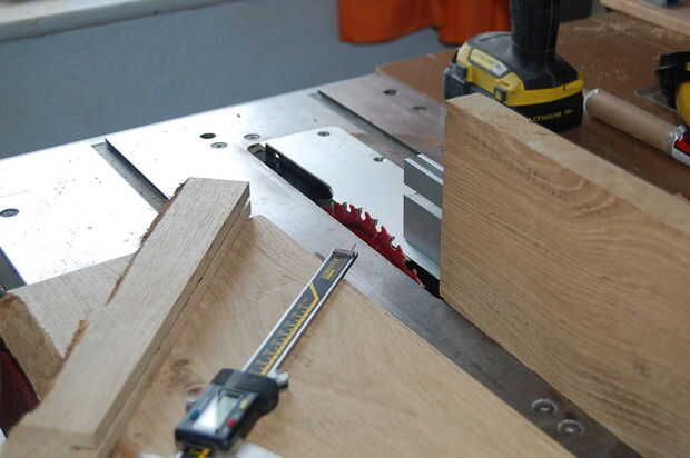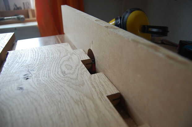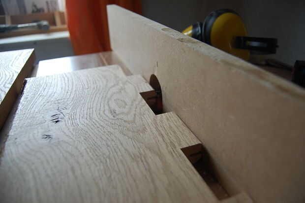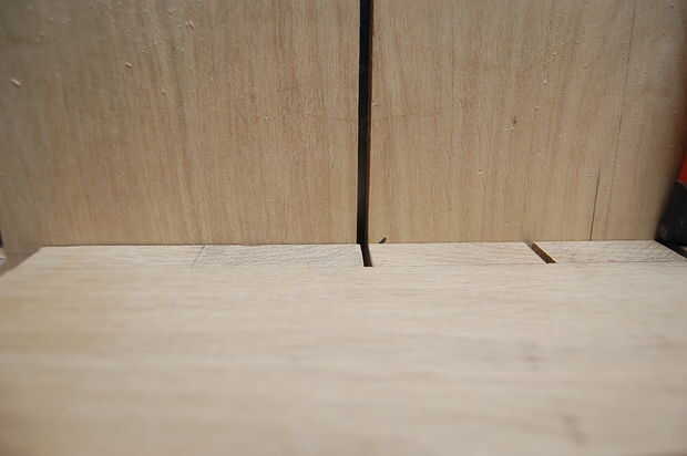 He decidido que se haría mi bisagra hasta 5 parte 3 en la parte posterior y 2 en la parte delantera, como mi ancho 300mm cada hueco de la bisagra parte sería 60mm. Primero corte la ranura en los dos paneles a la barra central, en mi primera pasada que la ranura no era bastante amplia así que recurrí a los paneles mediante 180degrees y cortar otra vez, esto aumentó la ranura por fracciones de milímetros pero fue suficiente para mi barra.