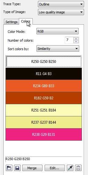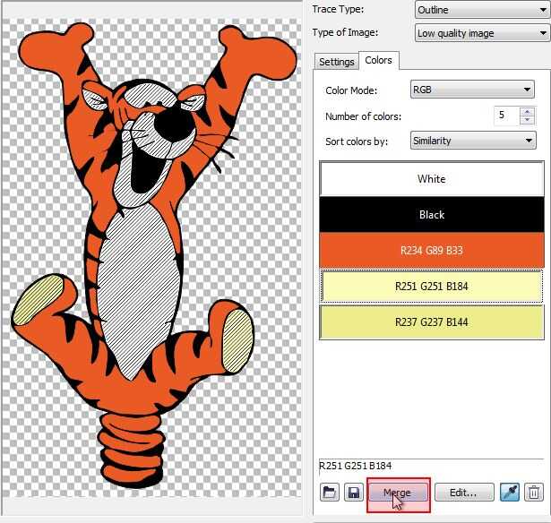 En este caso selecciona todos los "blancos" (R250 G250 B250, R251 G251, B184 y R237 G237 B144) y hacer clic en "combinar" en la parte inferior. Siguiente, para mantener los colores equilibrados, seleccionado de la rosa (nariz), naranja oscuro (boca) y la negra (rayas y líneas) y fusionó los porque no quiero que necesita conseguir vinilo sólo para aquellas piezas pequeñas.